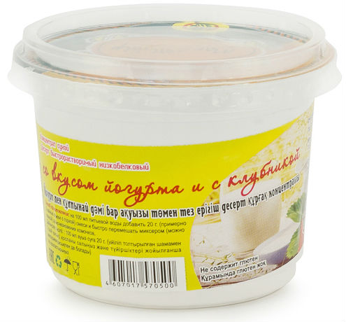 Состав: сухая сыворотка, обезвоженный сироп глюкозы, сухое кокосовое масло, обезжиренное сухое молоко, набухающий крахмал, лимонная кислота, клубника сушеная и порошок клубники сушеной.